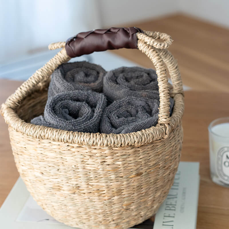 しなやかなシーグラスを手編みしたバスケット。丈夫で高い耐久性を誇ります。シーグラスは通気性良好で食品のストック場所としてもご活用いただけます。スタイリッシュで南国の雰囲気を感じさせるデザインはインテリアにも馴染みます。